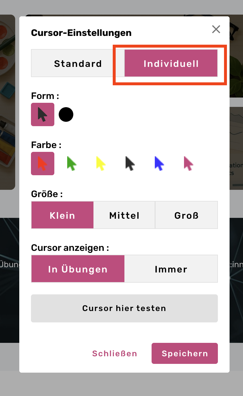 Wählen Sie „Individuell“ und legen Sie Form, Farbe und Größe des Cursors fest.