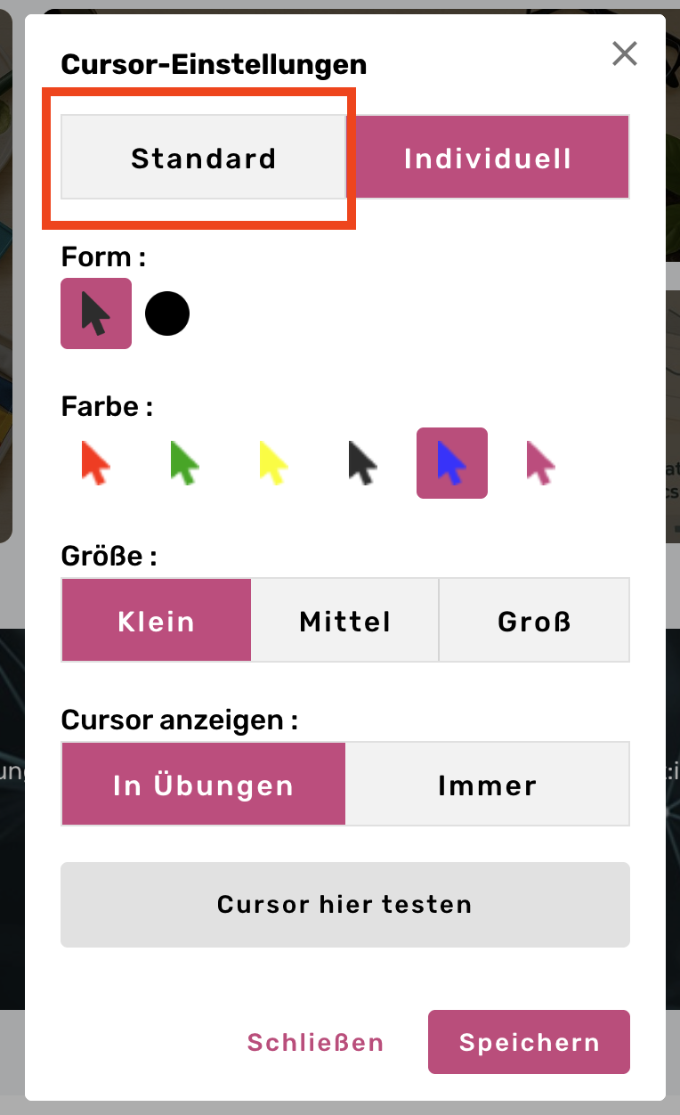 Bestimmen Sie, ob der Cursor überall auf der Seite oder nur während der Übungen angezeigt werden soll.